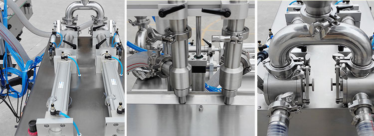 星火包裝機械之一 雙頭直線式醬料灌裝機,專用于大顆粒的醬料灌裝,解決了以前辣椒醬廠家需要大量人力才能完成灌裝的難題,并且提高了產品的灌裝精度。該機和物料接觸部位全部采用316L高級不銹鋼制成,動力使用臺灣亞德客氣缸推動,整機干凈大方、動力強勁,使很多客戶順利解決了ISO2000和QS認證。下圖為機器部件大圖展示: