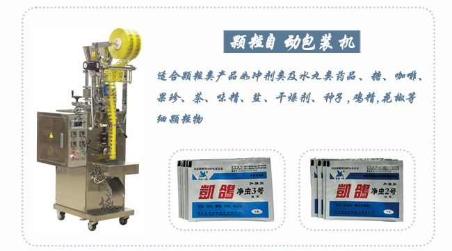 顆粒自動包裝機在醫藥行業是很受歡迎的,凱歌集團選擇這款顆粒自動包裝機擁有旗下的鴿藥包裝;配合自動貼標機更加方便了工作自動顆粒包裝機可以自動完成計量、制袋、充填、封合、打印批號、切斷及計數等全部工作;采用全數字顯示對于操作者來講更一目了然;采用電腦控制,步進電機驅動拉袋,自動完成包裝袋的定位、定長;包裝了包裝的密封性,藥品不外漏