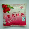 本包裝件適用于醬油、醋、果汁、牛奶等液體,采用0.08mm聚乙烯薄膜,其成型、制袋、定量灌裝、油墨印字、封口切斷等過程全部自動進行,薄膜在包裝前進行紫外線消毒,符合食品衛生的要求。