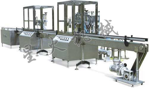 | 旋轉式灌裝機技術參數: 灌裝閥個數:12個 灌裝容量:0.1-2L 灌裝精度:±1% 灌裝物粘度:7-370 cp(50℃) 壓縮空氣壓力:0.4-0.6MPa 壓縮空氣消耗量:0.1M/3M 最大生產功率:3000瓶/時 (100ml) 主傳動電機功率:2.2kw(3相 380V 50Hz) 外形尺寸:2100×2370×2700 mm (長×寬×高) 重量:2000 kg | 自動旋蓋機(配振盤式送蓋機,不同規格瓶蓋需更換振盤)技術參數: 適用瓶身直徑:50-90mm 適用瓶蓋直徑:18-50mm 驅動電機:370W 輸送速度:5-15米/分鐘 輸送帶寬度:82毫米 輸送帶:賽鋼鏈片式 生產能力:>3000瓶/分鐘 額定電壓:220V/50Hz 整機功率:800W 輸送帶離地高度:750毫米±20毫米 | 立式貼標機技術參數: 額定電壓:220V/50Hz 整機功率:1000W 外型尺寸:1700×1100×1300 mm 整機重量:200Kg 適用產品范圍:外徑20-90mm,高度50-230mm 適用標簽范圍:高15-100mm, 長 20-300 mm 生產能力:>3000瓶/小時(包括貼標和噴碼) |