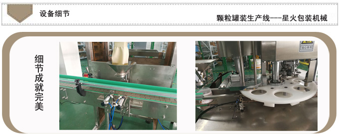 顆粒罐裝生產線-全自動顆粒灌裝包裝生產線根據不同用戶的瓶裝,聽裝,桶裝,標準瓶,異形瓶及實際產品特性和用戶要求實現自動化;該設備能夠實現人工上瓶、備料后,自動理瓶、稱重、灌裝、旋蓋、封口、貼標、收罐等全過程的自動運行。減少勞動力,節約成品,實現無人化包裝生產